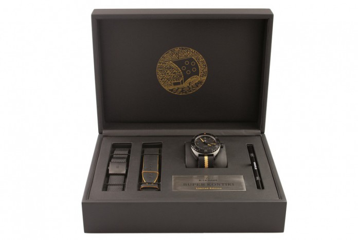 Présentée dans un luxueux coffret doté d’un petit outil pour le changement de bracelet par soi-même, la Super KonTiki Black en édition limitée est proposée avec trois bracelets : un bracelet en cuir noir, un bracelet Nato noir rehaussé d’une bande médiane orange en accord avec la couleur des aiguilles et un bracelet milanais en acier recouvert de PVD noir réglable au millimètre près offrant un confort au porter.
