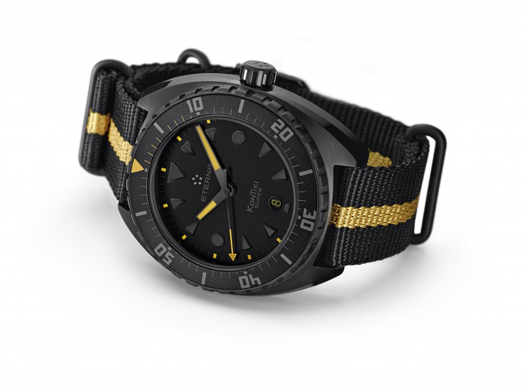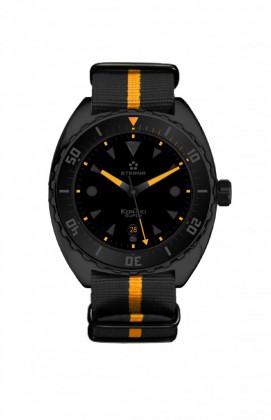 La Super KonTiki Black en édition limitée se distingue par un mystérieux boîtier noir. De couleur identique, le cadran met en évidence des aiguilles de couleur orange et des points lumineux près des index horaires, le tout en en Superluminova afin de garantir une parfaite lisibilité, quelle que soit la luminosité.