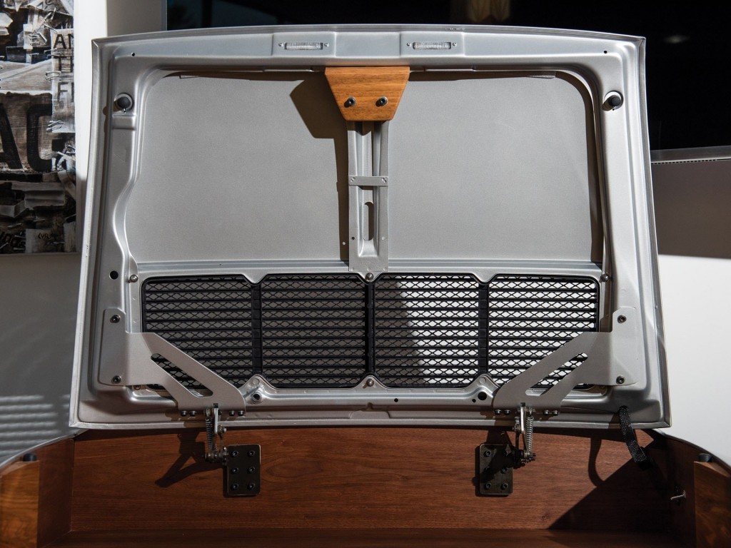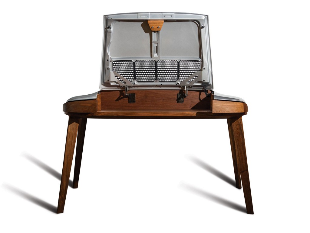 C’est le cas de ce bureau dont les galbes sont inspirés de la poupe de la Porsche 911. Si l’automobile inspire la création de mobiliers, rares sont les réalisations à atteindre ce niveau de qualité. Ce bureau, posé sur ses quatre pieds en noyer américain, s’agrémente d’un capot moteur de couleur grise, issu d’une Porsche 911 des années 60. Articulé, il s’ouvre sur un espace de travail permettant de recevoir un ordinateur portable Porsche Design. Sur chaque côté prend place un tiroir de rangement. Ce bureau, fabriqué à la main ne sera produit seulement qu’à 17 exemplaires.