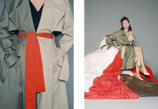 - Le Trench Aprilia bicolore est comme coupé en deux et traversé par une ceinture orange.