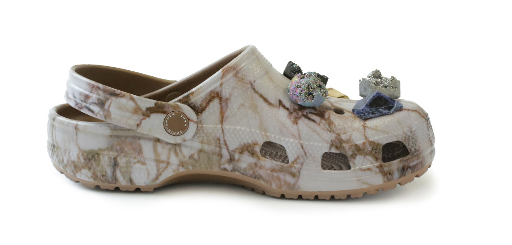 Christopher Kane raconte : « Je travaille toujours avec des environnements inattendus permettant de rendre le quotidien plus désirable. Je voulais apporter ma patte et mon ADN aux classiques Clogs et réaliser quelque chose de vraiment spécial. L’imprimé marbre ressemble beaucoup à la terre et j’imagine parfois les Crocs dans un univers naturel porté avec une robe de soirée ou un jean. En ajoutant ces pierres précieuses, j’ajoute un peu de luxe dans ce style de tous les jours. Les Crocs sont incontestablement les chaussures les plus confortables et j’adore le fait qu’elles aient un style particulier et que certaines personnes les trouvent « laides ». Elles ont une forme très enfantine et naïve et j’aime particulièrement lorsqu’elles paraissent ultra massives aux pieds. »