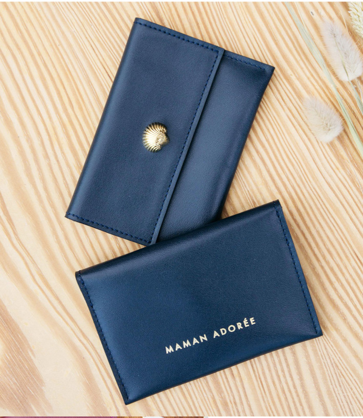 Les portes-cartes et les Porte-clés Fauvette Paris x émoi émoi sont proposés en couleurs bleu marine et en bordeaux.
