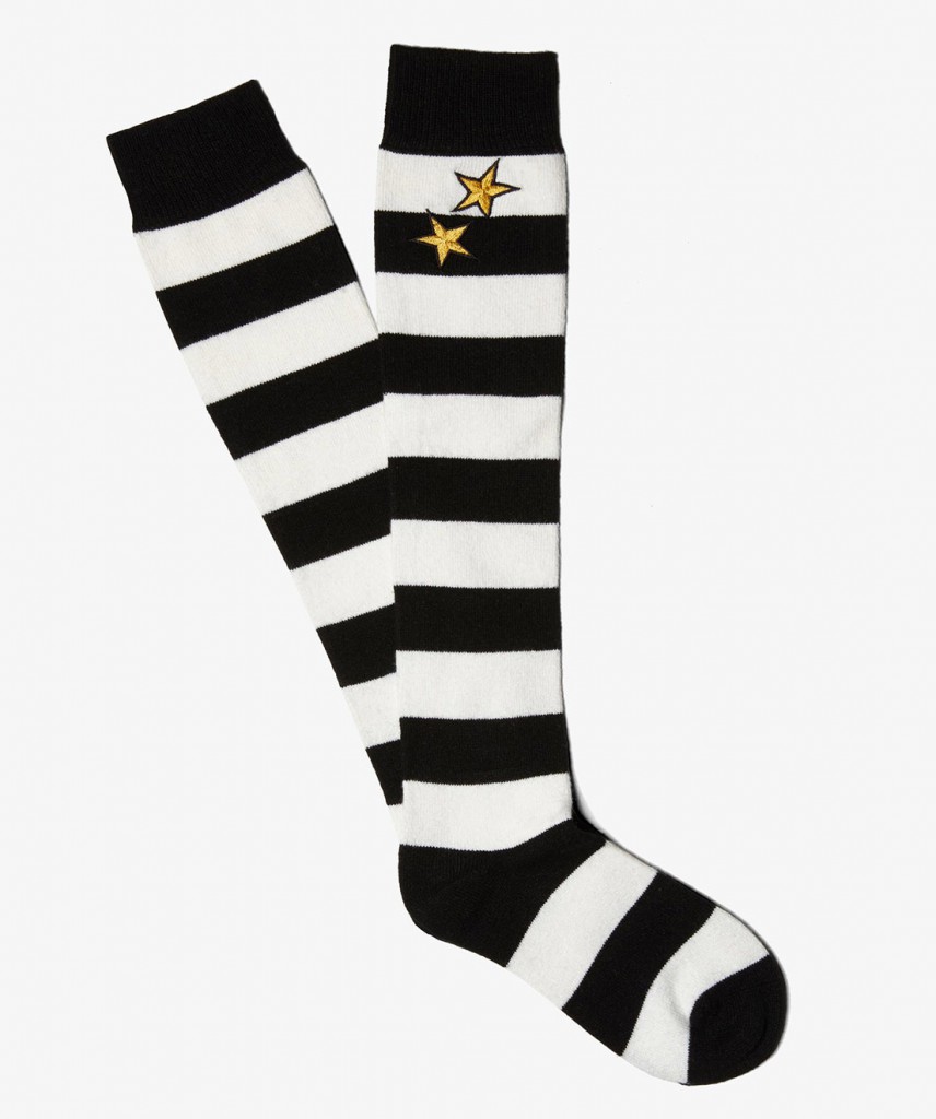 Pour compléter cette collection, Bella et Perry nous ont également concoctés des écharpes punk et rayées en laine d’Écosse, ainsi que des chaussettes hautes de collégiennes, preuve que tous les styles peuvent se mélanger !