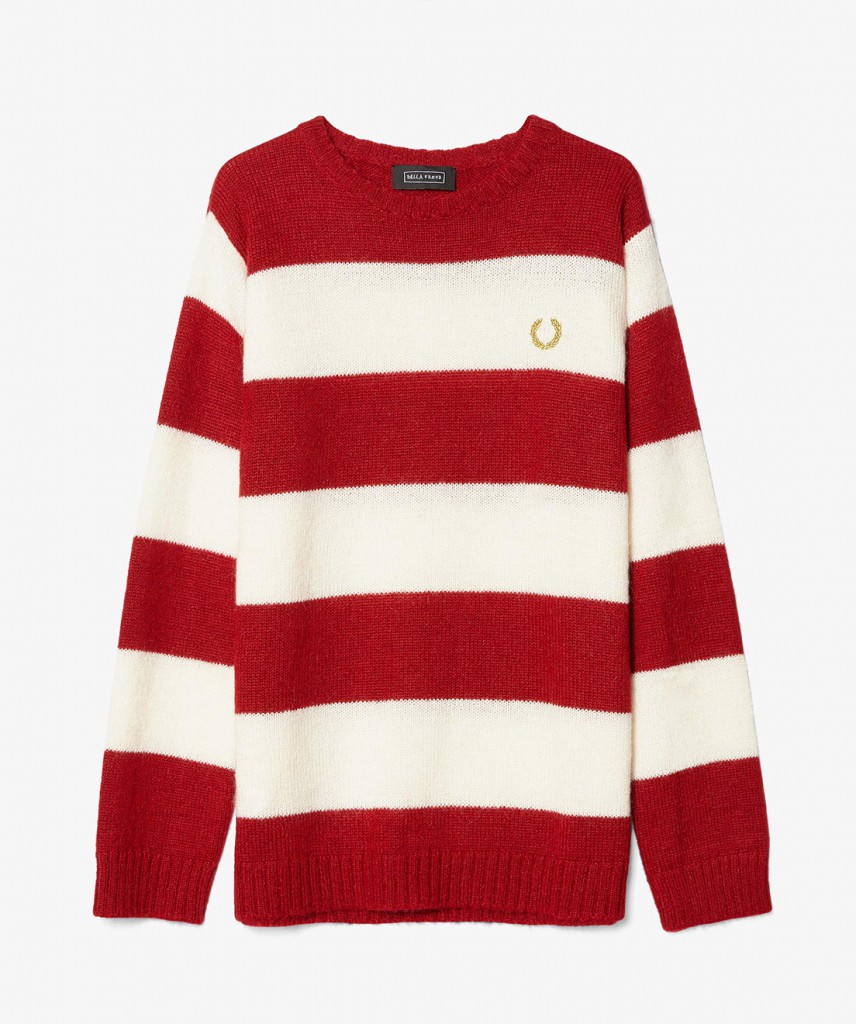 On peut y reconnaitre le logo de Bella (deux étoiles en or brodées), ainsi que l’emblématique couronne de laurier de Fred Perry ornant l’un de ses polos iconiques, deux chemises Vichy aux cols « pelle à tarte » typique des seventies, ainsi qu’un pull sans manches en laine d’un bleu renversant.