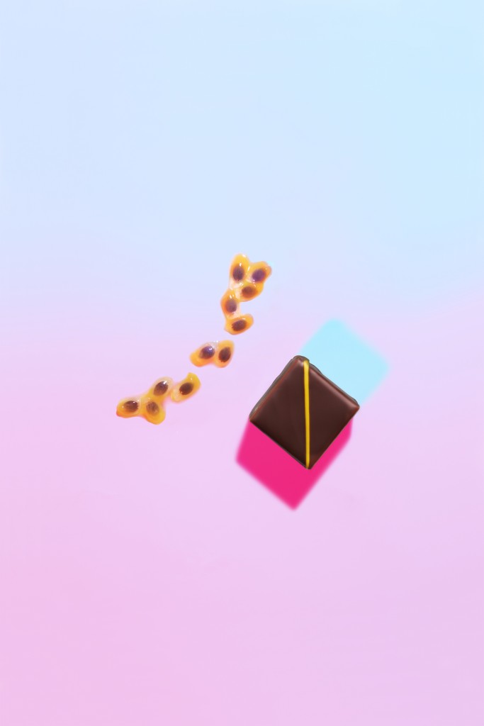 Passionnément chocolat : Quand une fine feuille de chocolat aux fruits de la passion soumet la puissance chocolatée de la ganache noire pure origine de République Dominicaine, ses arômes frais de fruits jaunes aux notes acidulées complètent le corsé du chocolat noir dans une association passionnée.
