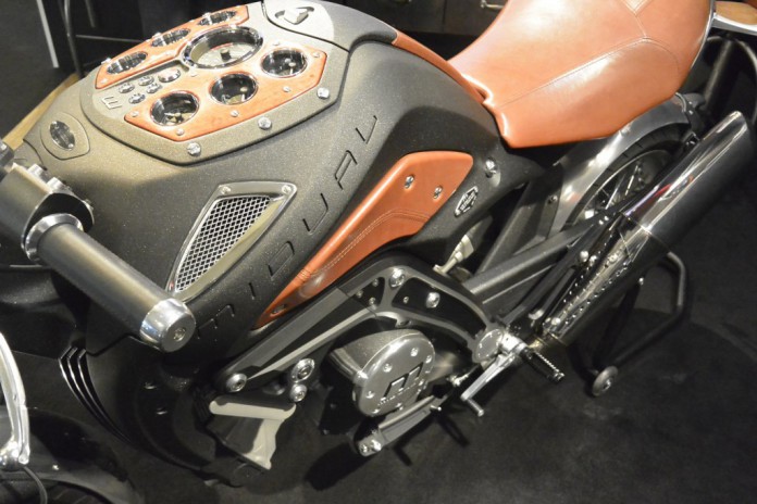 Le motocycle est construit autour de deux particularités uniques : son moteur flat twin à vilebrequin transversal incliné à 25° et une coque massive à double paroi, coulée d’une seule pièce en alliage léger aéronautique et modelée à la main.