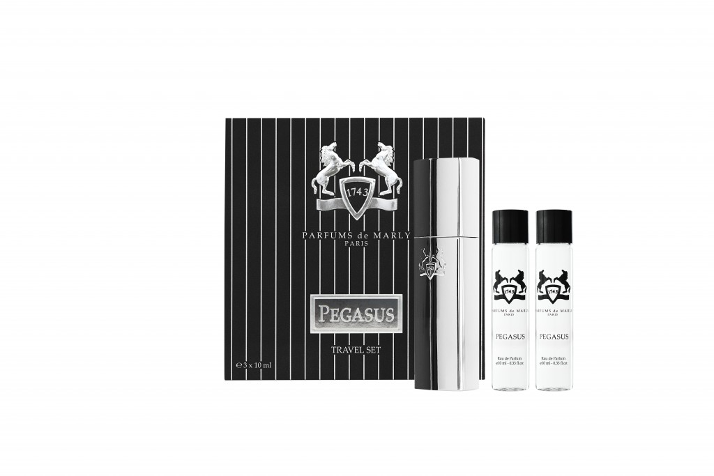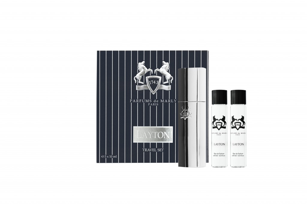 Ce compagnon de voyage est proposé avec un étui argenté en zamac gravé du logo Parfum de Marly contenant une fiole de 10ml. Accompagné de deux recharges supplémentaires de 10ml.