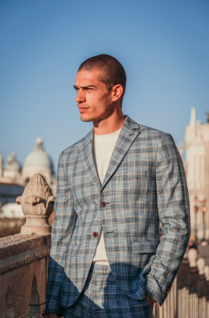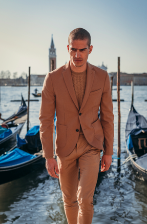 - Des pièces emblématiques comme « Weekend à Venise » constituée d’un costume bleu à carreaux agrémenté de rayures caramel, pièce phare de cette collaboration.